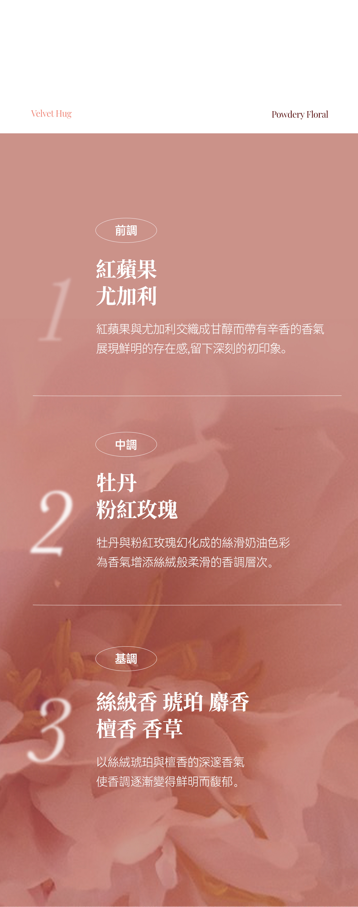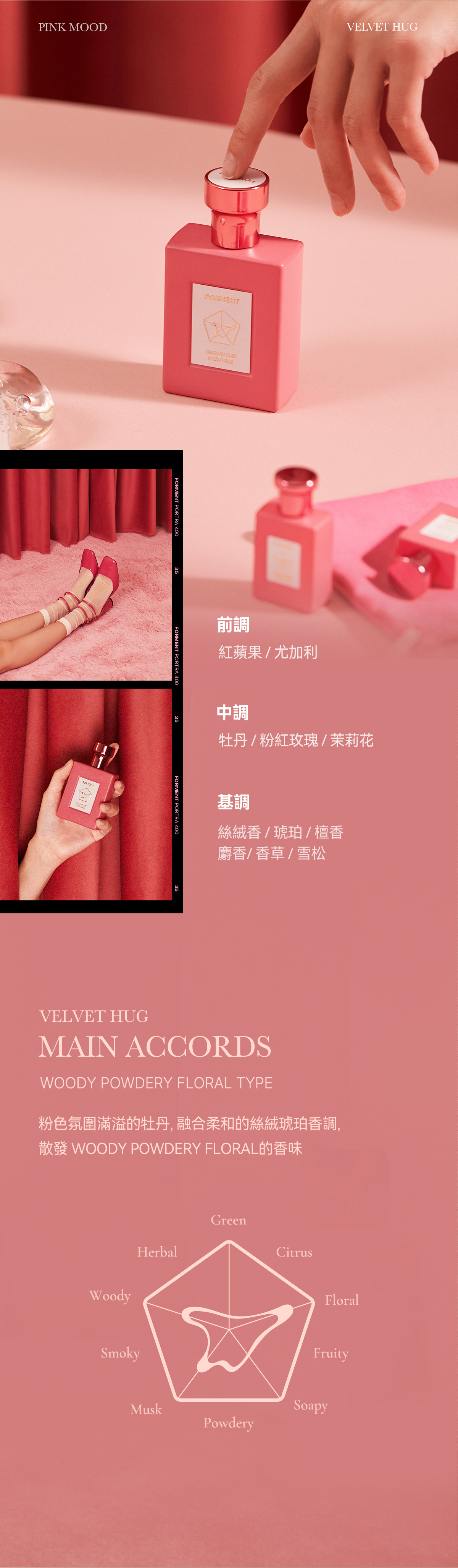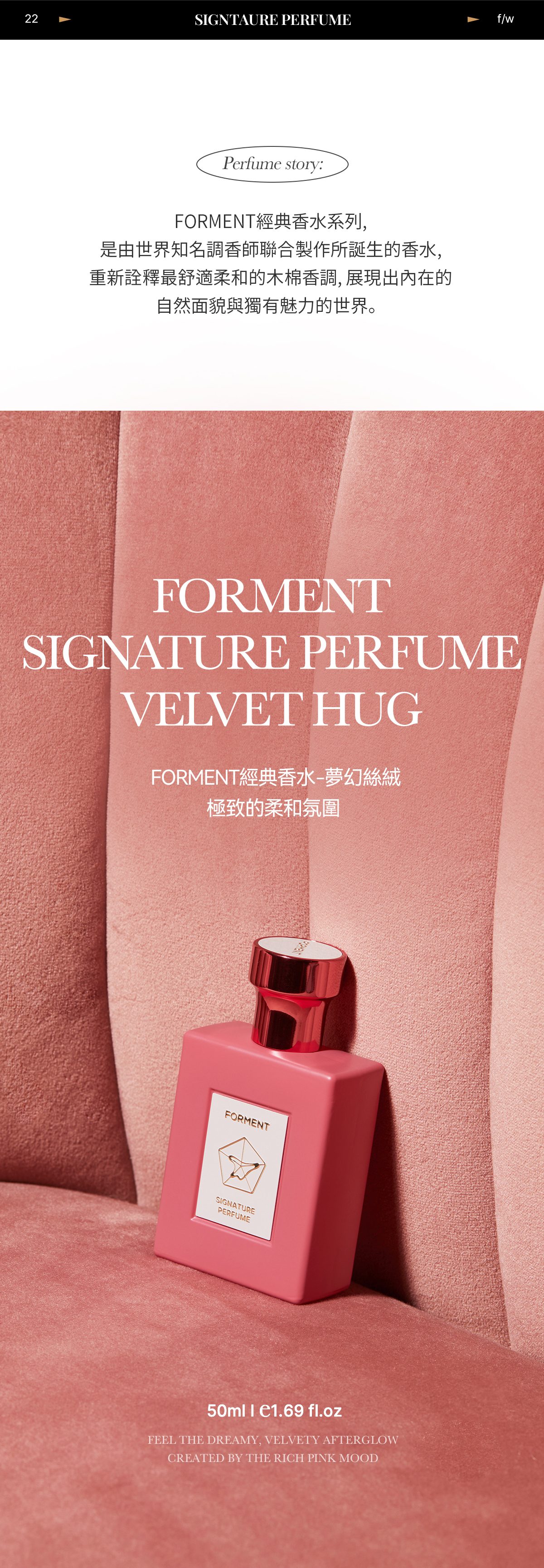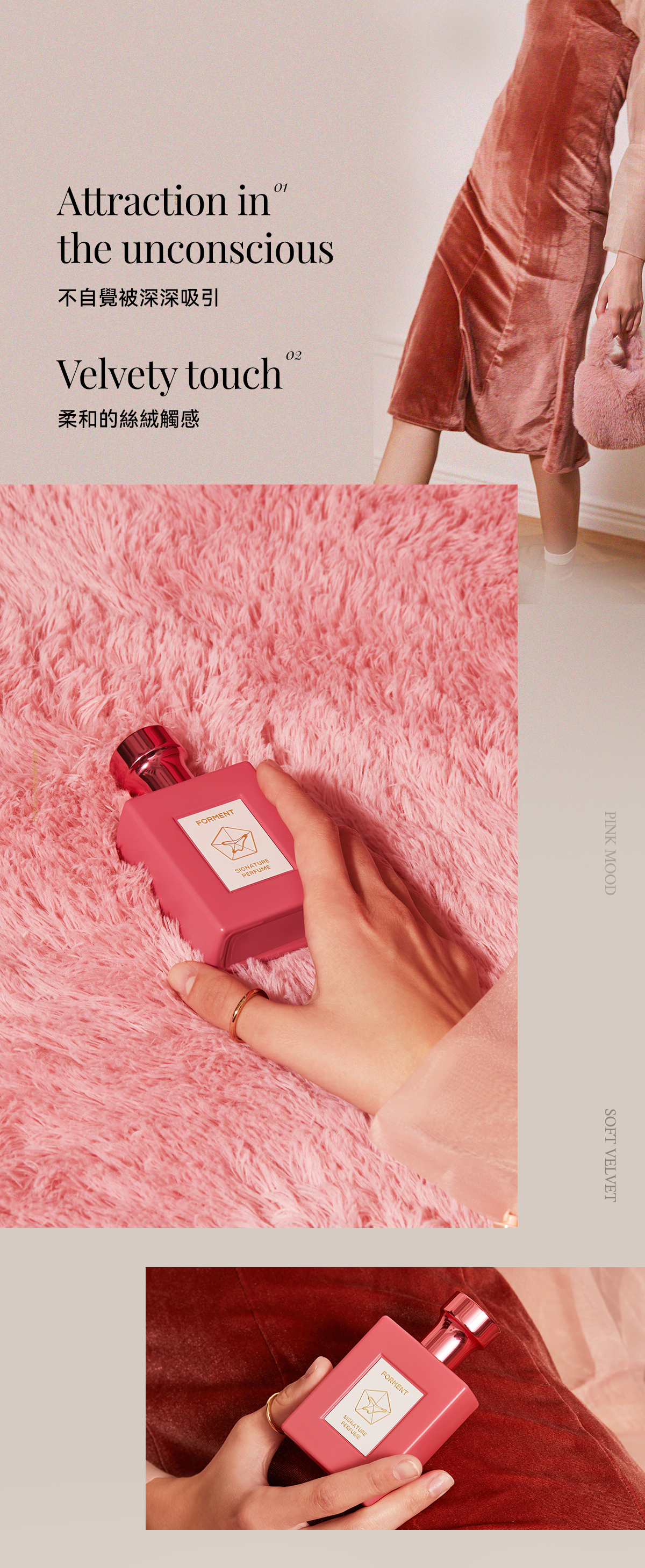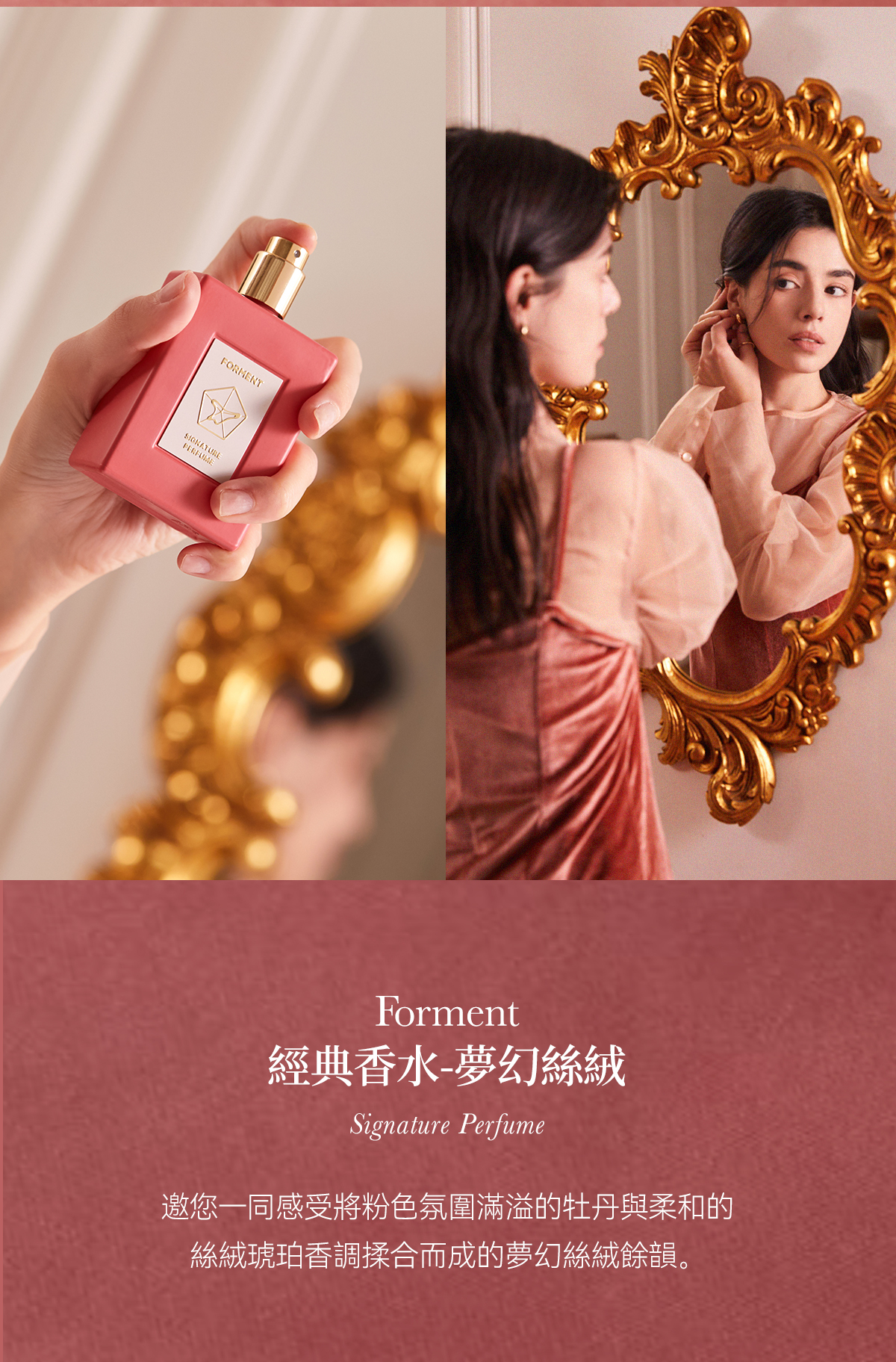 Forment 經典香水-夢幻絲絨(50ml)極致的優雅觸感,絲絨甜美的紅蘋果香味中,添上牡丹與粉紅玫瑰絲滑細膩的色彩,帶來夢幻的絲絨香氣。無意地深深吸引著我的視線,留下的香氣沁人心脾。蘊含絲絨的優雅和溫暖的經典香水 '夢幻絲絨',演繹無意地被深深吸引的故事。*紅蘋果, 牡丹, 粉紅玫瑰, 絲絨香, 麝香